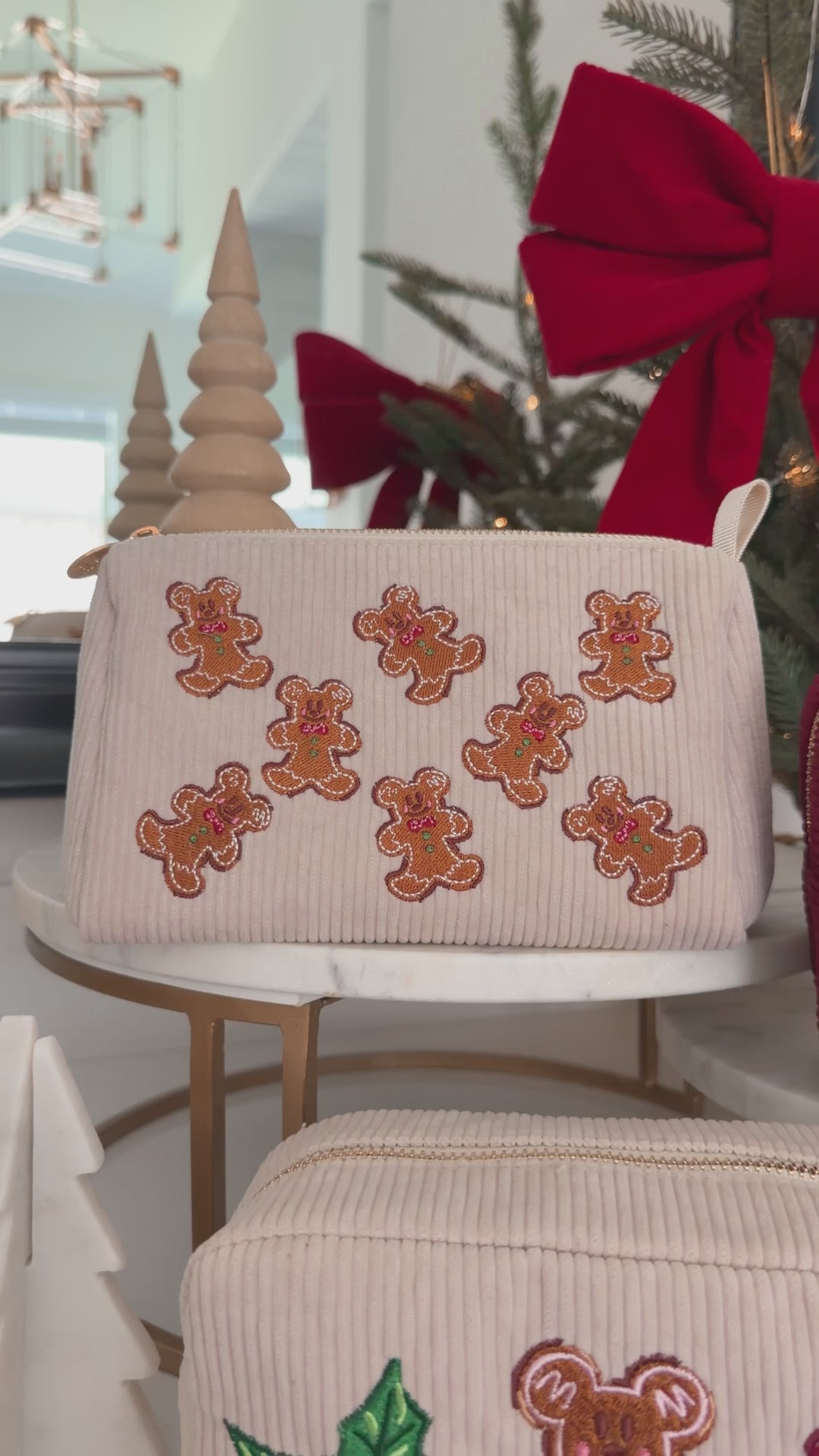 Our Gingerbread Lane Cosmetic Bags are here to bring a little holiday magic to your routine. Each bag is made from soft ribbed corduroy and embroidered with the sweetest gingerbread details. The roomy interior is perfect for makeup, travel essentials, hair accessories, or park day must haves with a sturdy zipper to keep everything secure.