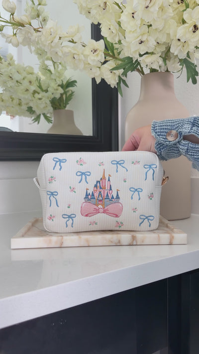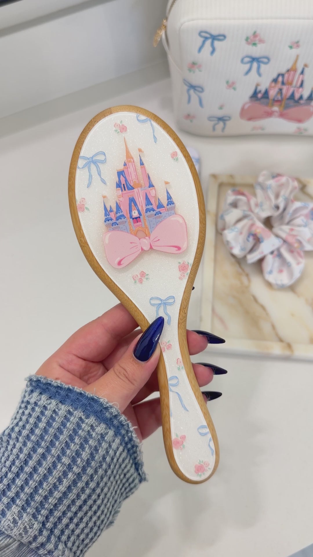 Bring a little magic to your routine with our Castle Dreams Hair Brush. Featuring our dreamy bow and castle print with soft pastel tones and a charming pink bow detail, this brush is as pretty on your vanity as it is in your park bag.