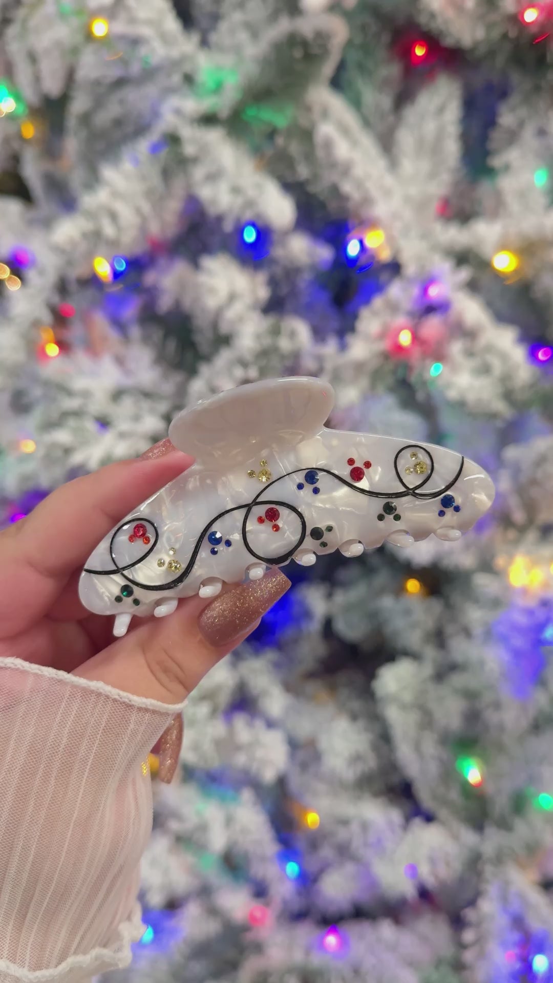 Our Magical Lights claw clip, featuring a trio of gems, and our Holiday lights claw clip, featuring pear shaped gems, are made of long-lasting biodegradable cellulose acetate. Each piece is hand assembled for a strong, all day hold. They are suitable for all hair textures, making them ideal for elegant updos or an effortlessly beautiful half up half down look. These claws are 4 inches with Merry & Bright and colorful gem details around the buckle of the clip.